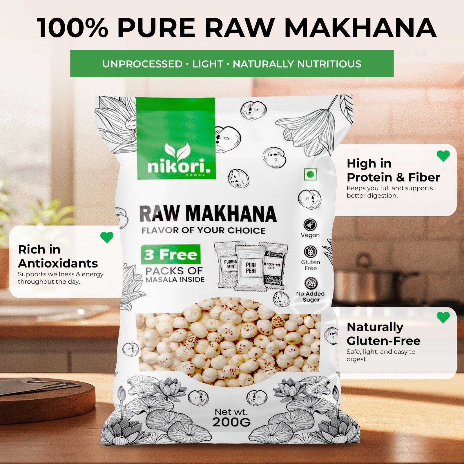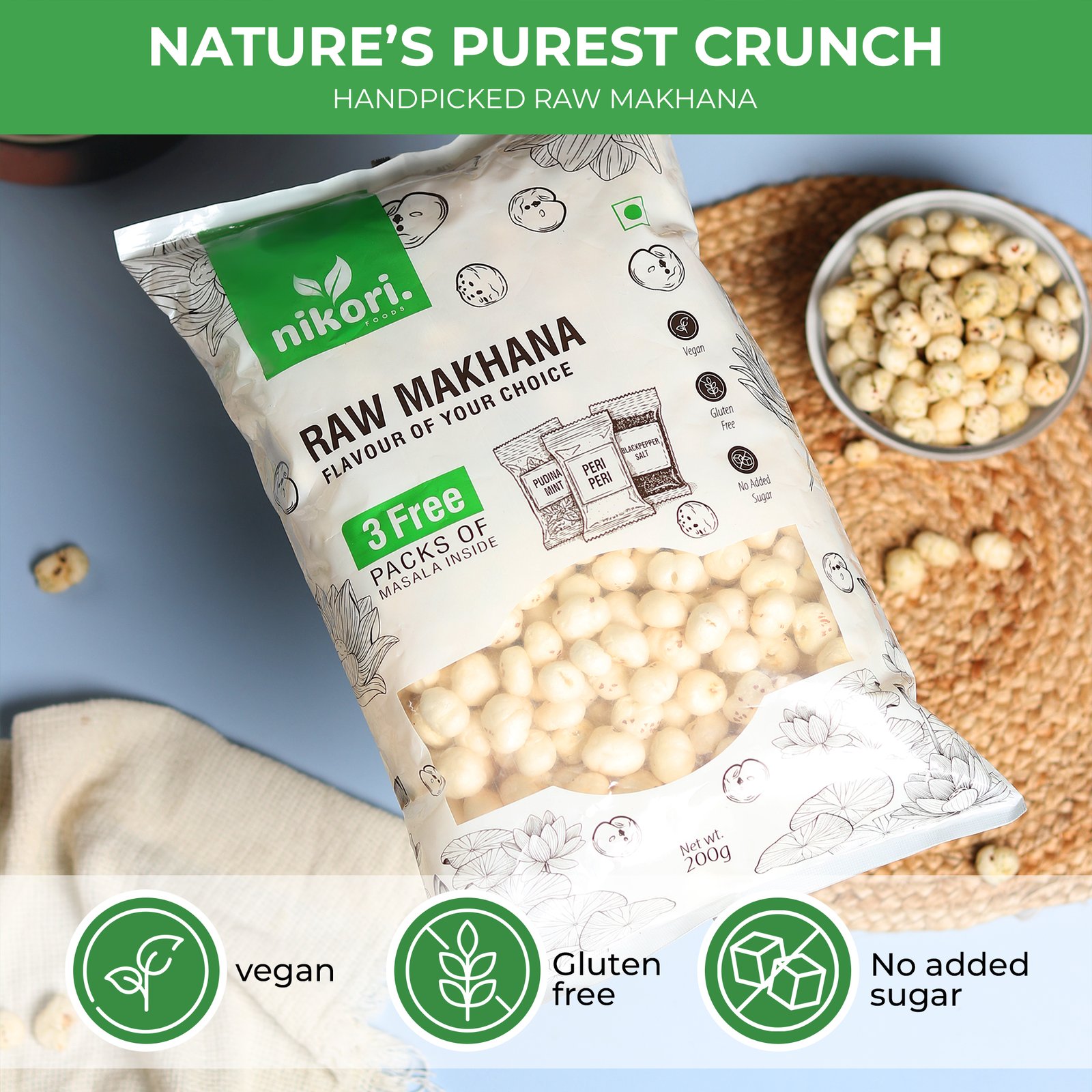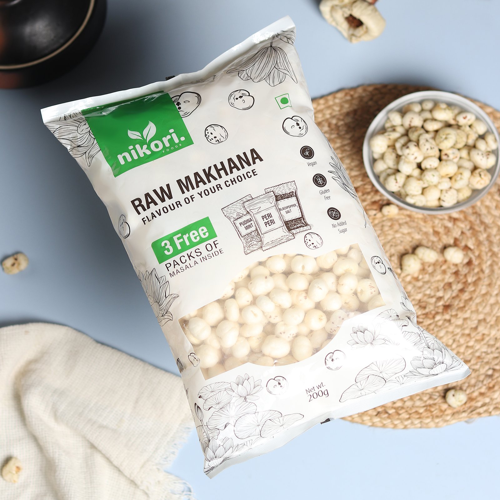 Inside every 200 g pouch, you also get 3 free masala sachets — Peri-Peri, Pudina Mint, and Himalayan Salt & Pepper — so you can flavour your makhana your way, anytime!